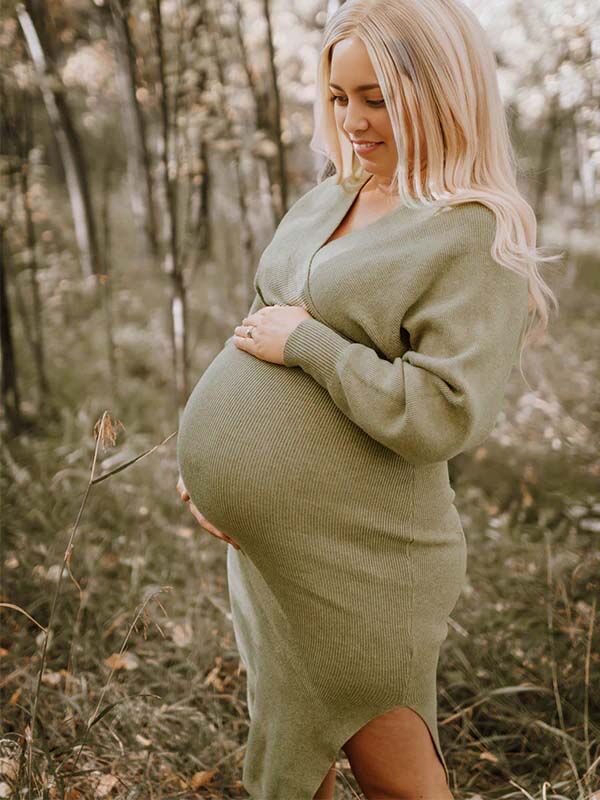 Momyknows Knit Solid Color Sashes V-Neck Double Split Backless Bodycon Photoshoot Maternity Sweater Midi Dress