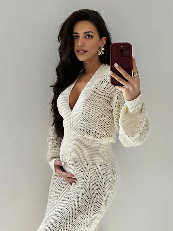 Momyknows White Crochet Knit Hollow Out Deep V-neck Lantern Sleeve Bodycon Elegant Going Out Maternity Sweater Maxi Dress