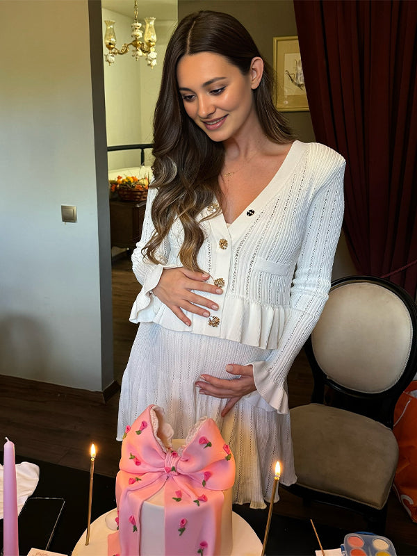 Momyknows White Buttons Ruffle Knit Cut Out Elegant Baby Shower Maternity Mini Sweater Dress