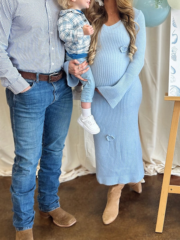 Momyknows Light Blue Hit Color Flare Sleeve Mermaid Elegant Photoshoot Baby Shower Maternity Maxi Sweater Dress