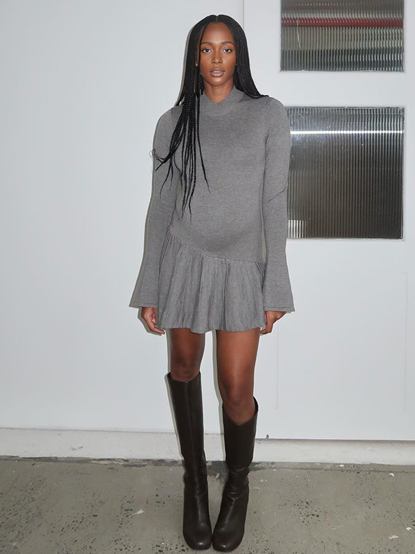 Momyknows Knit Pleated High Neck A-line Maternity Mini Sweater Dress
