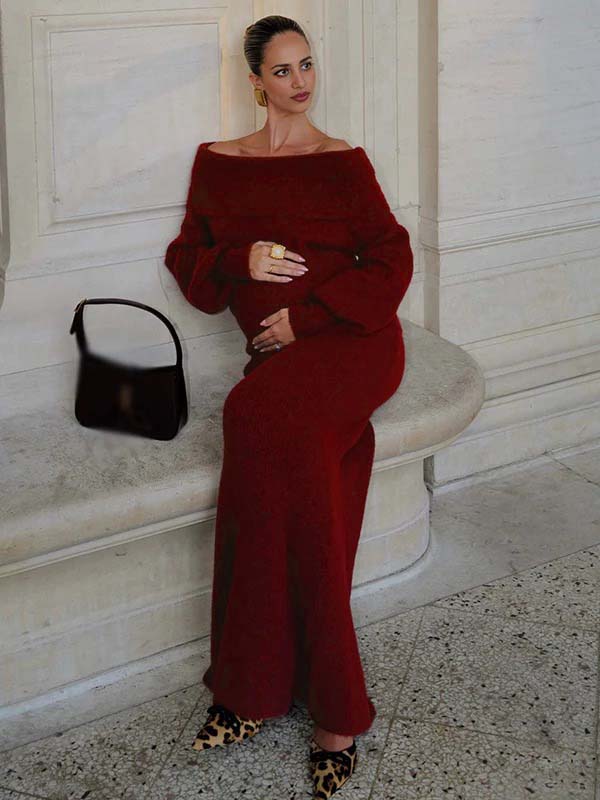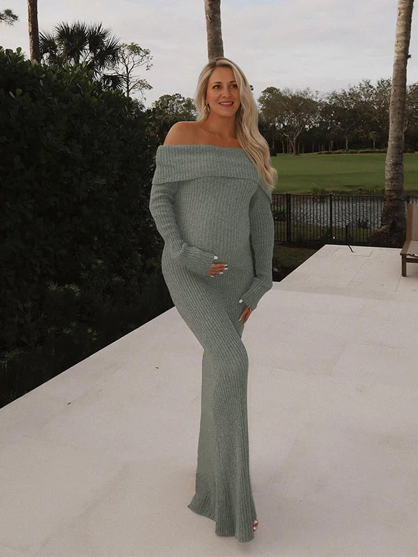 Momyknows Off Shoulder Solid Color Mermaid Bodycon Elegant Photoshoot Maternity Maxi Sweater Dress