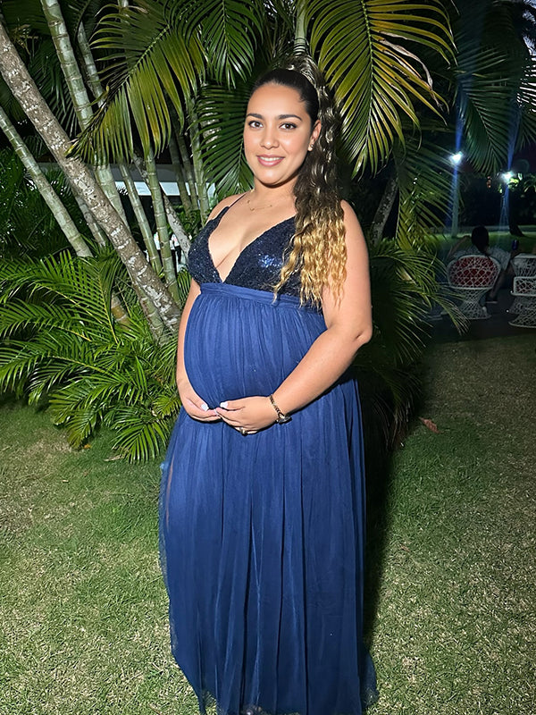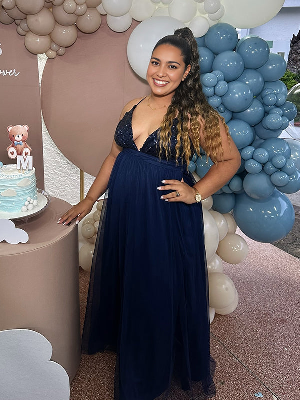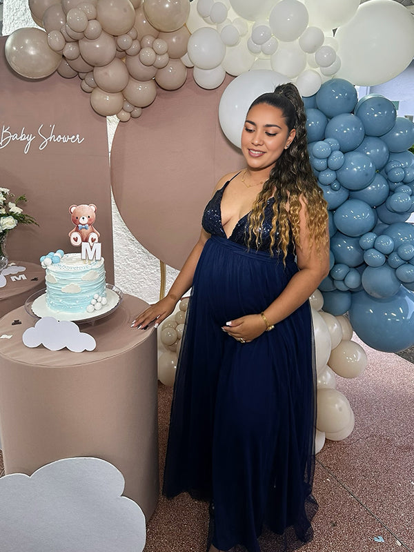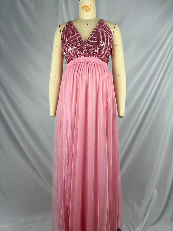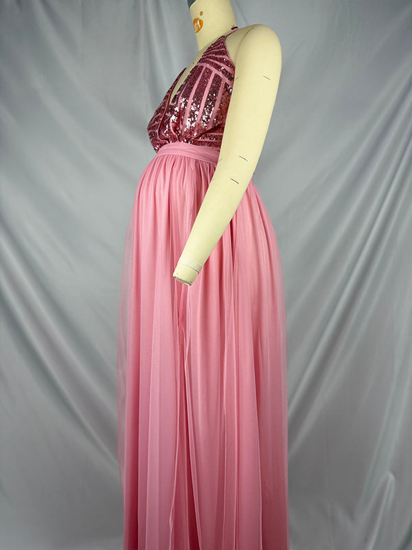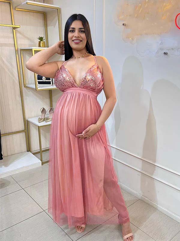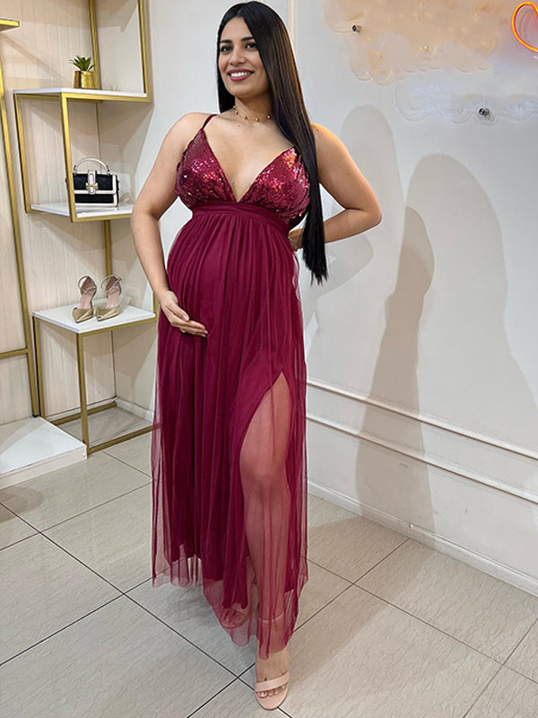 Momyknows Glitter Sequin Tulle Side Slits Big Swing Cami Backless Elegant Maternity Baby Shower Maxi Dress