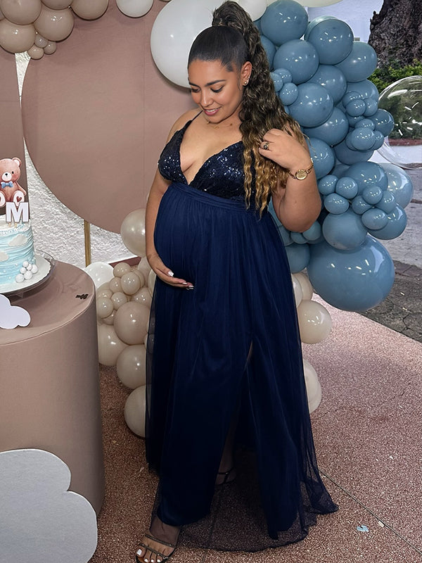 Momyknows Glitter Sequin Tulle Side Slits Big Swing Cami Backless Elegant Maternity Baby Shower Maxi Dress