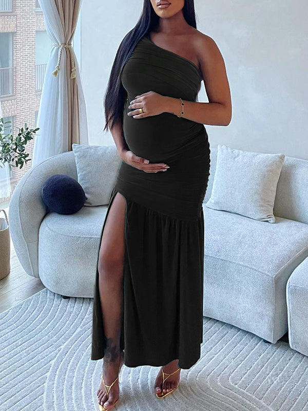 Mesh One Shoulder Ruched Side Slit Mermaid Maternity Maxi Dress
