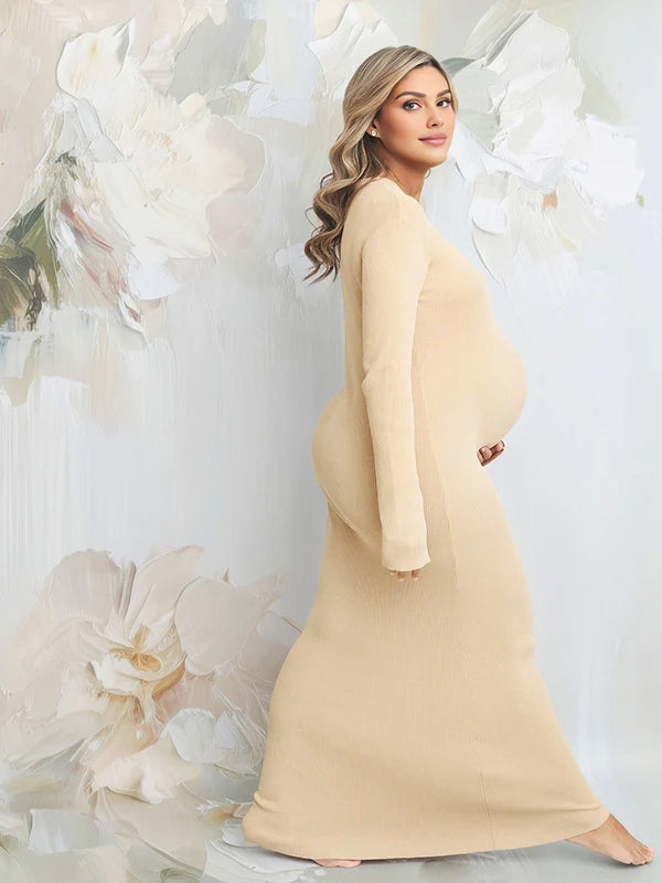 Momyknows Apricot Round Neck Crochet Maternity Baby Shower Sweater Maxi Dress