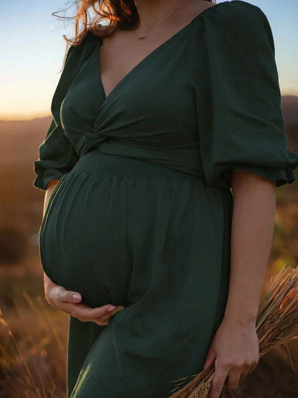 Momyknows Dark Green Smocked Cross Chest Tie Back A-line Boho Maternity Maxi Dress