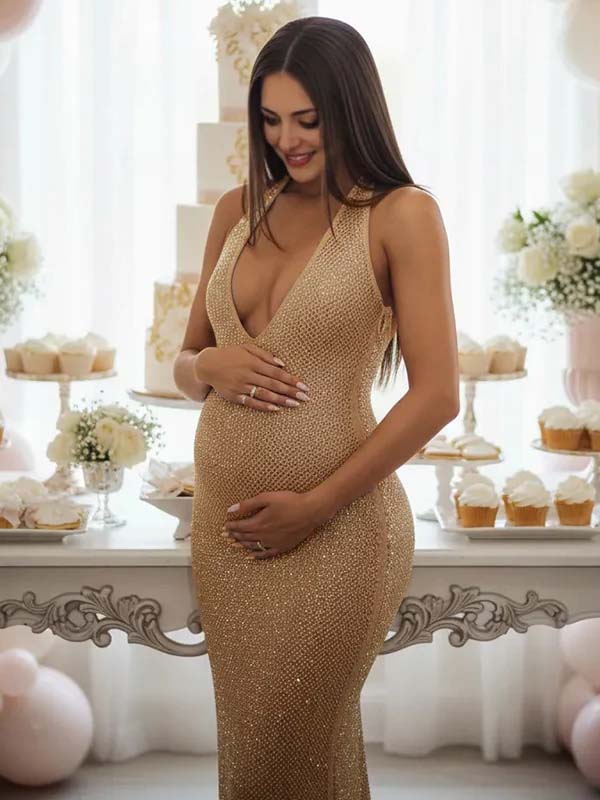 Momyknows Glitter Sequin Ruched Backless Halter Neck Bodycon Maternity Maxi Dress