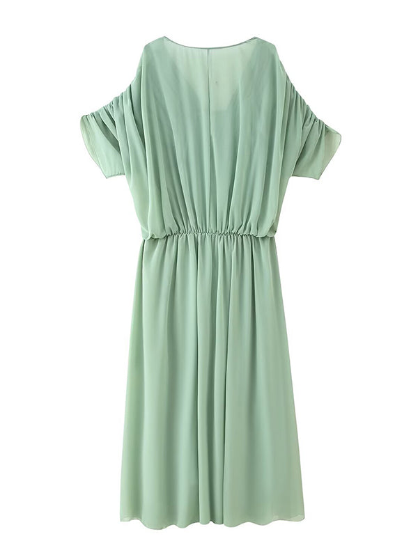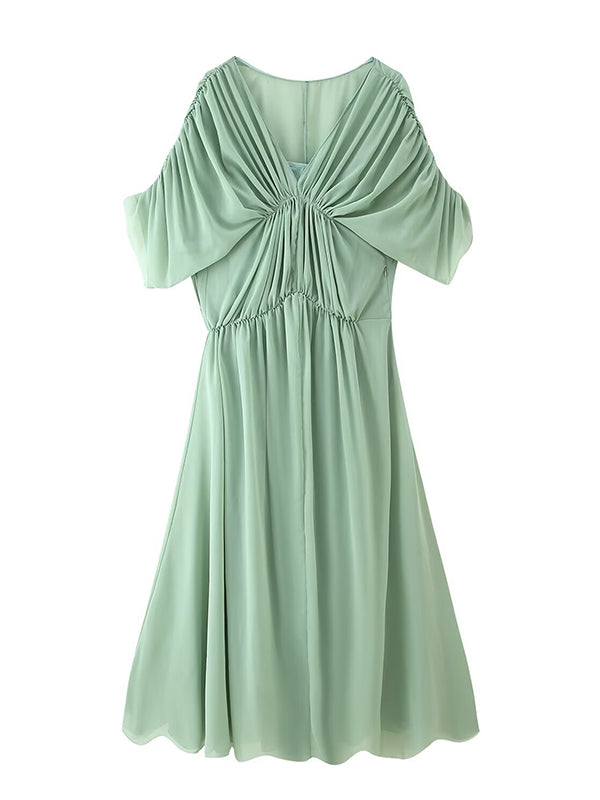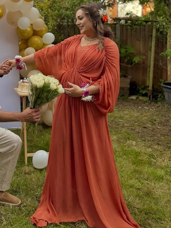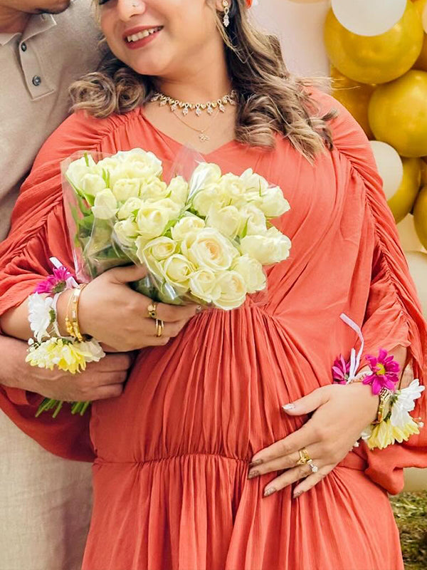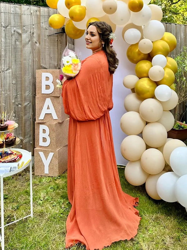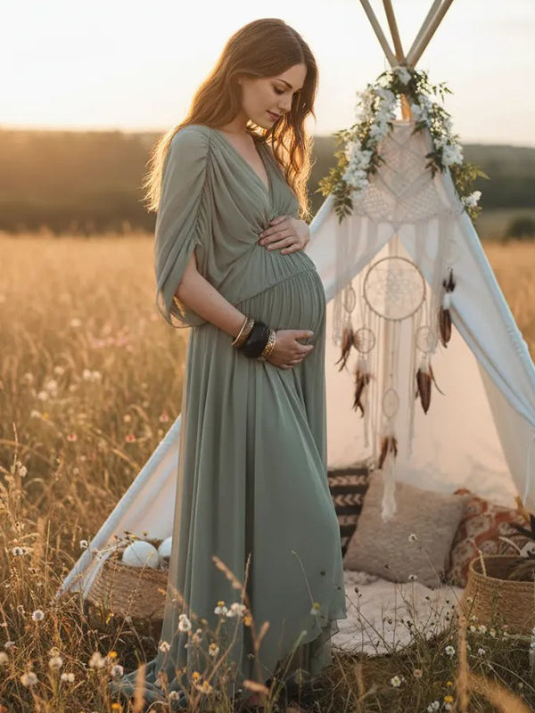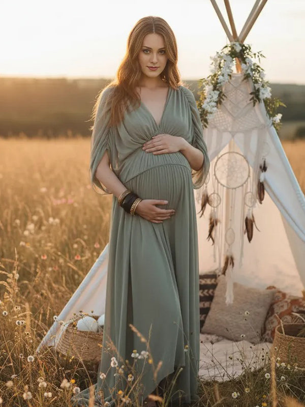 Momyknows Irregular Ruched Big Sing Cape Sleeves Flowy Maternity Maxi Dress