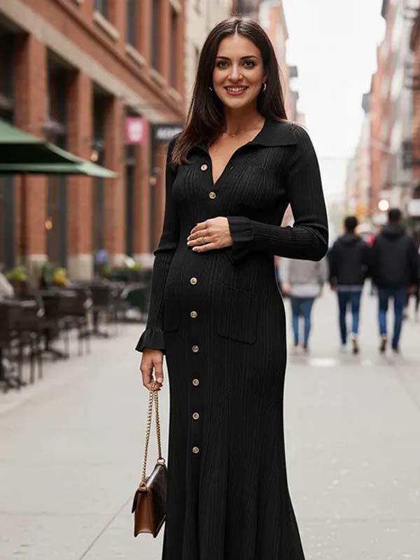 Momyknows Knit Single Breasted Ruffle Pockets Slit Polo Maternity Sweater Maxi Dress