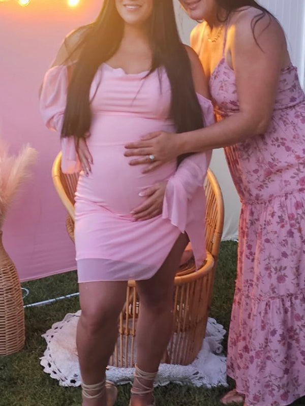 Momyknows Pink Mesh Ruched Off Shoulder Side Slit Cami Maternity Mini Dress