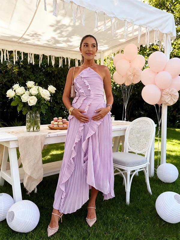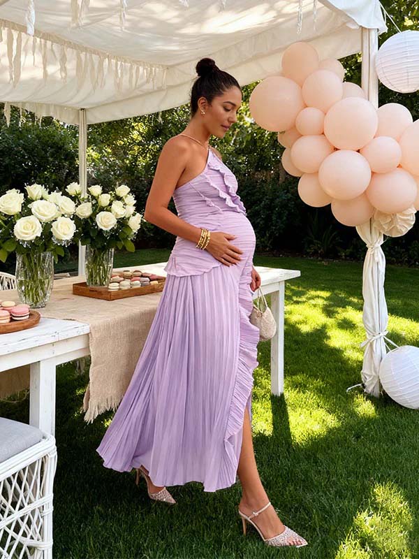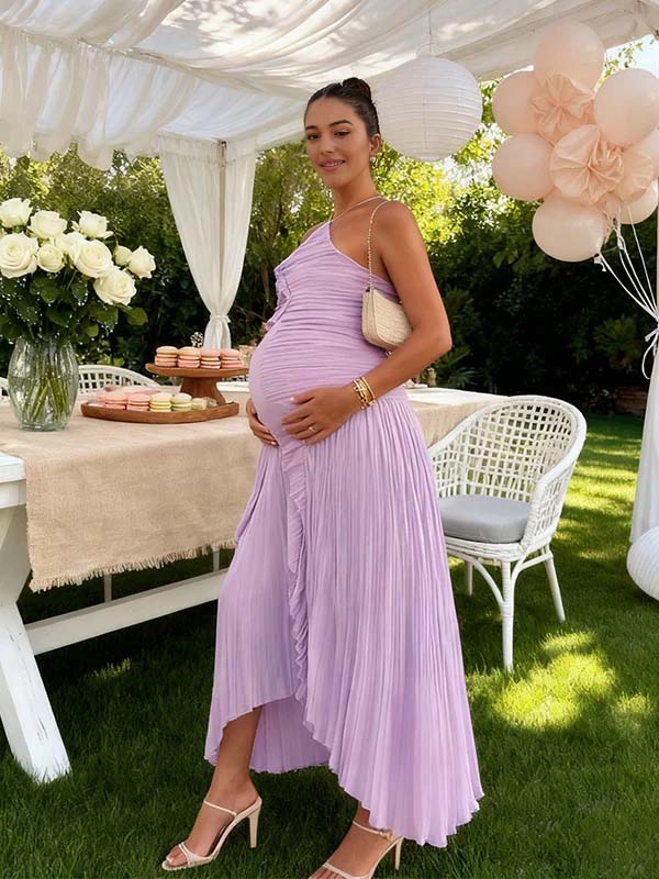 Momyknows Purple Pleated Ruffle Slit Irregular Baby Shower Maternity Maxi Dress