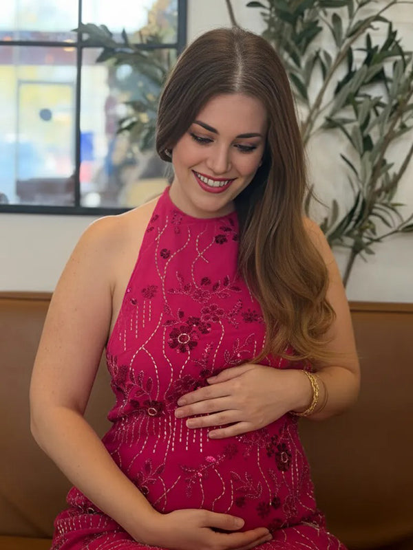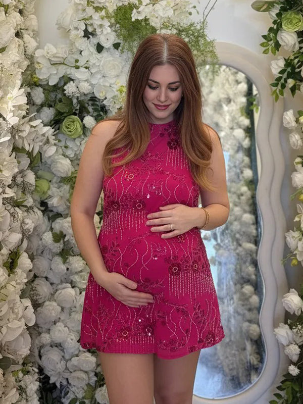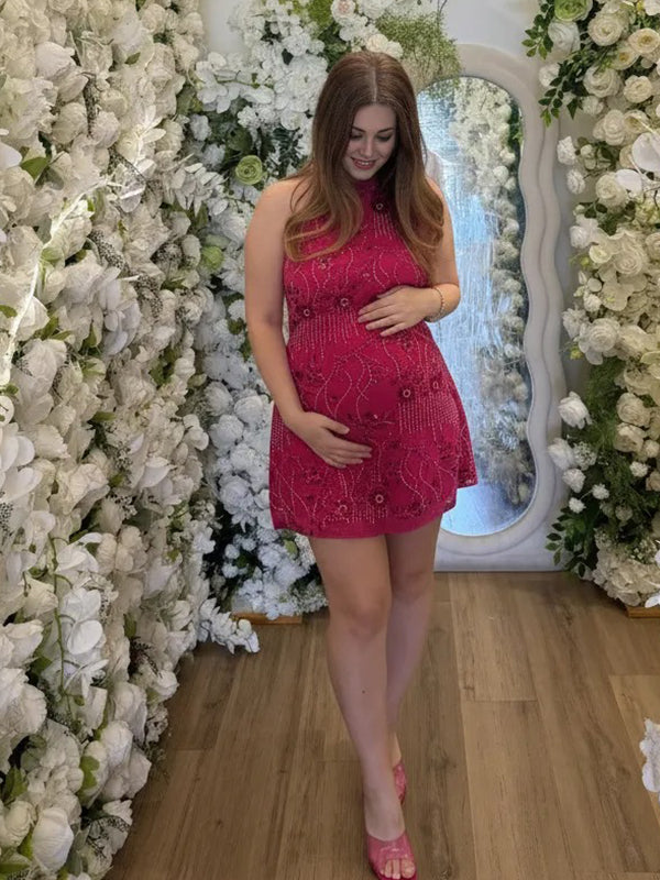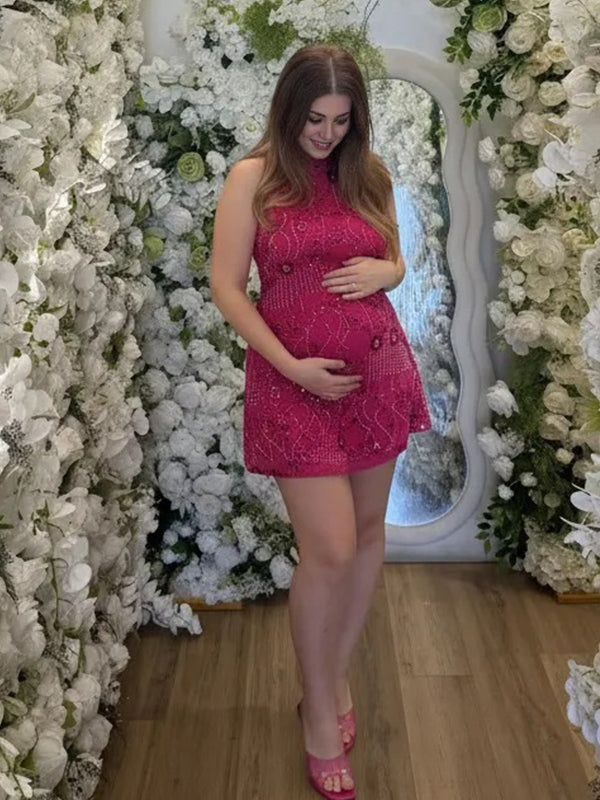 Momyknows Rose Carmine Sequin Beading Embroidery Halter Neck Backless Maternity Mini Dress