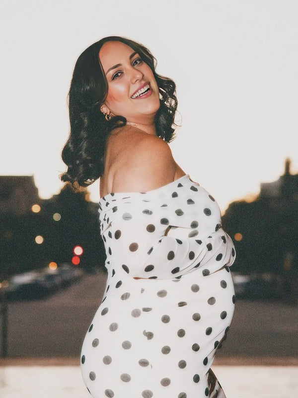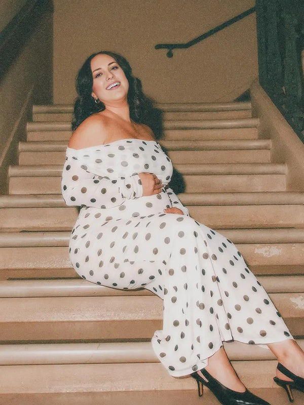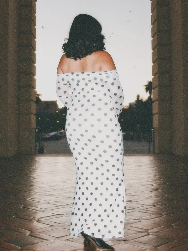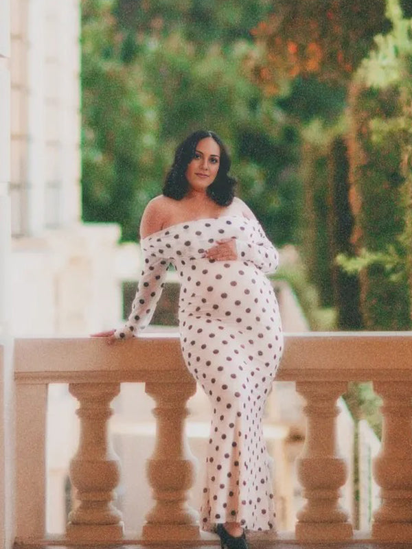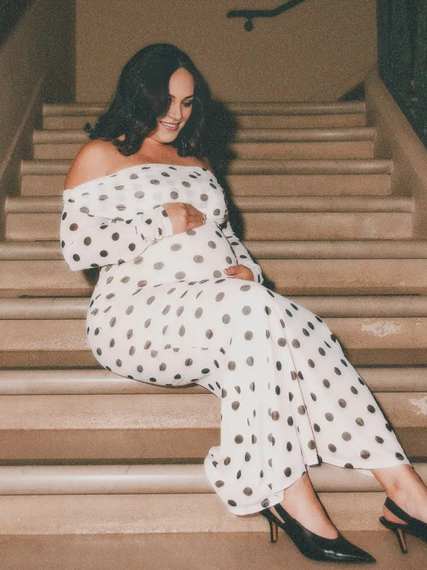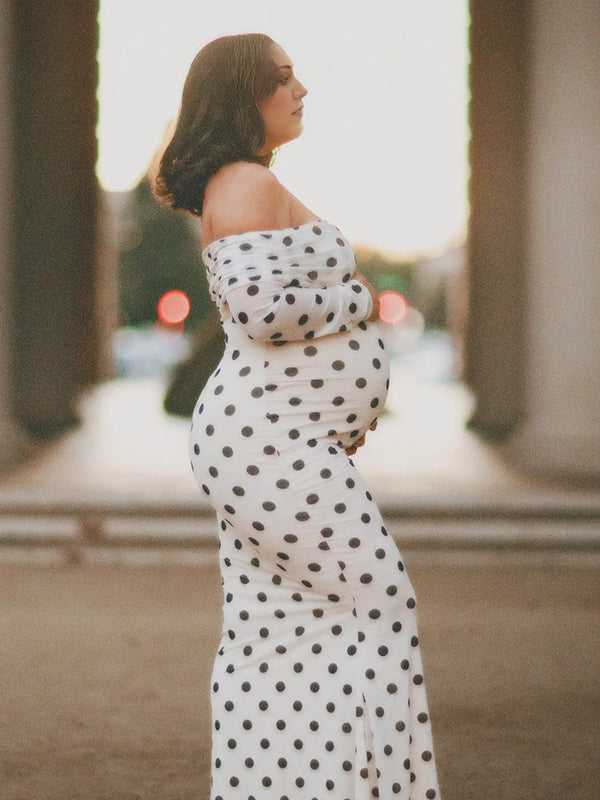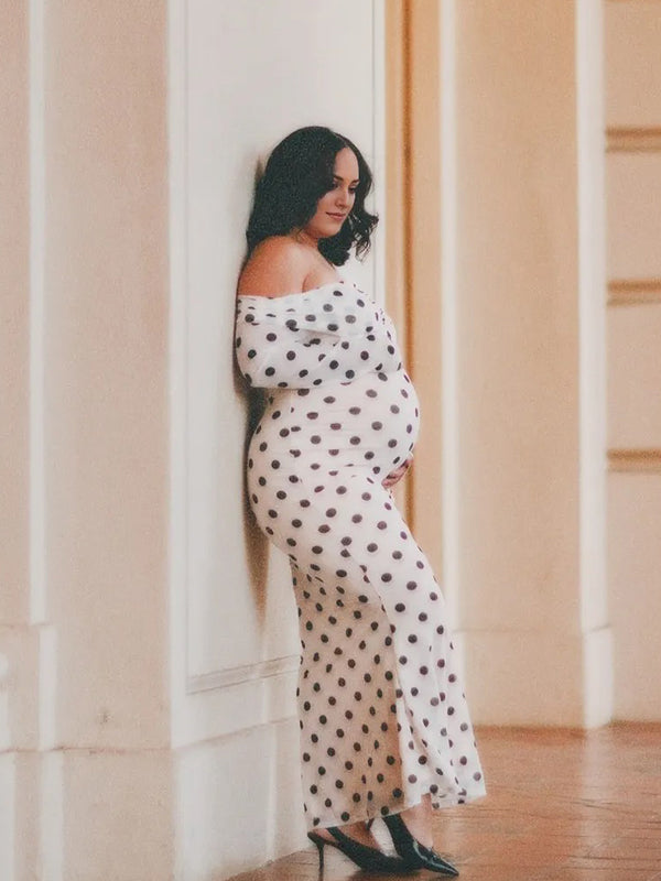 Momyknows White&Black Polka Dot Mesh Ruched Off Shoulder Bodycon Maternity Maxi Dress