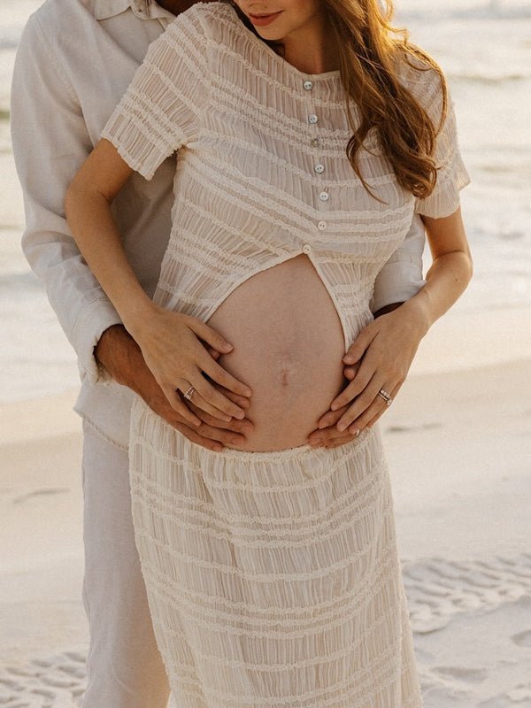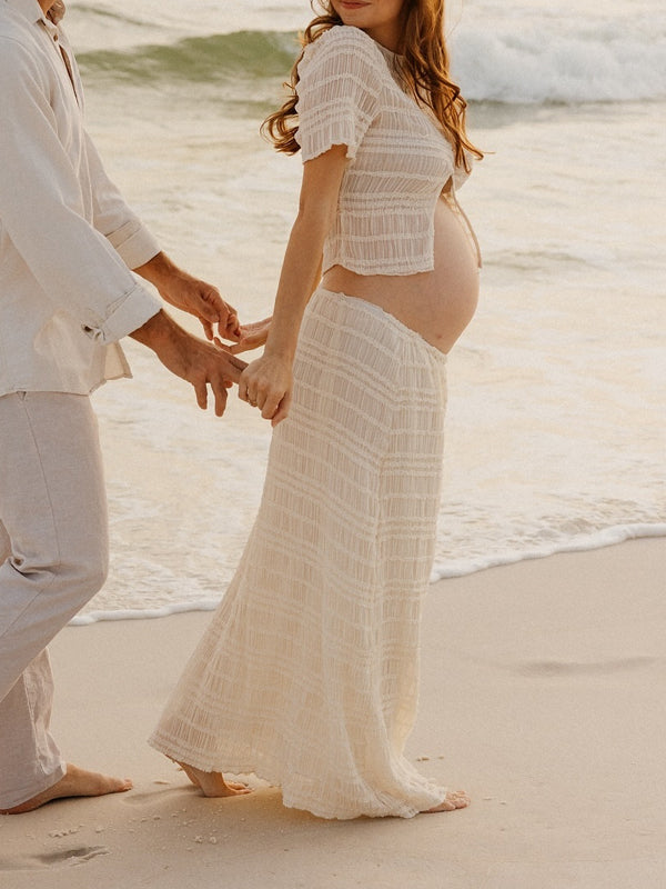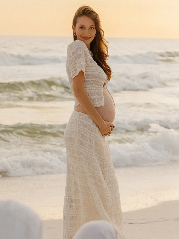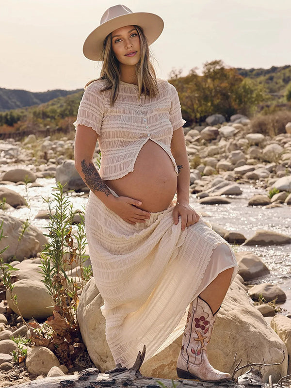 Momyknows White Wood Ear Edge Button Ruched Lace-up Two Piece Maternity Photoshoot Maxi Dress