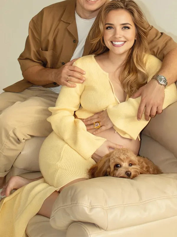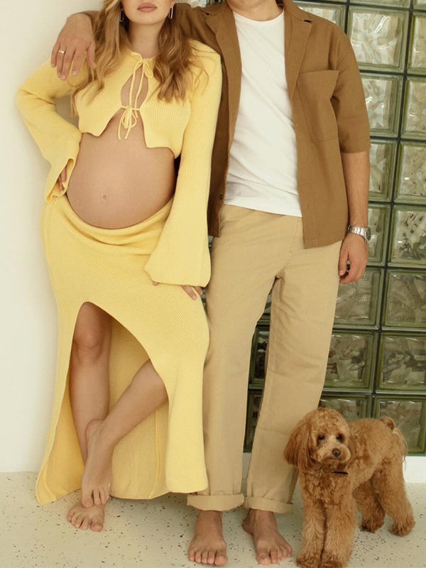 Momyknows Yellow 2 Pieces Side Slit Knit Tie Photoshoot Maternity Maxi Sweater Dress