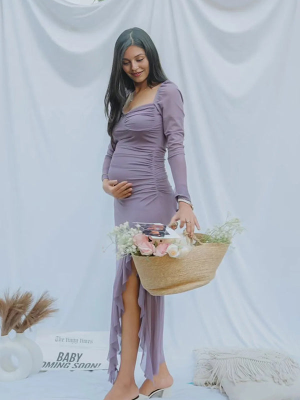 Momyknows Purple Pleated Ruffle Slit Irregular Baby Shower Maternity Maxi Dress