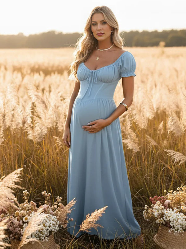 Momyknows Ruffle Ruched Lace-Up Big Swing Boho Maternity Maxi Dress