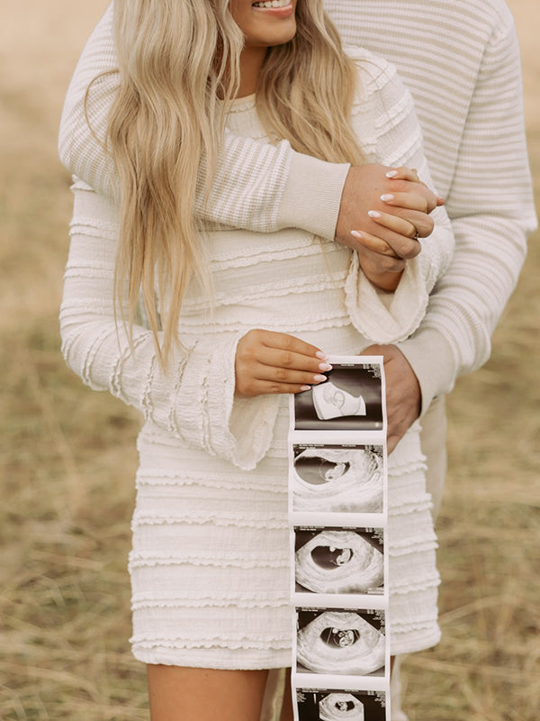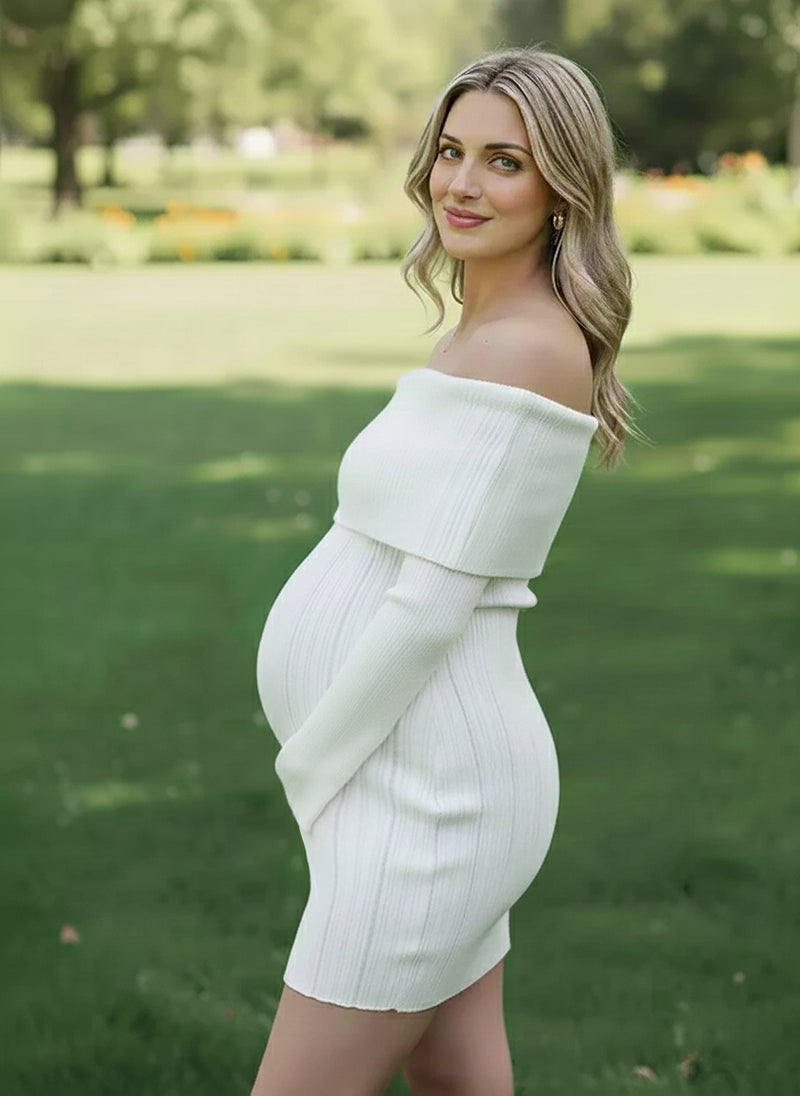 Momyknows Beige Wavy Edge Cut Out Bodycon Elegant Photoshoot Baby Shower Maternity Maxi Sweater Dress