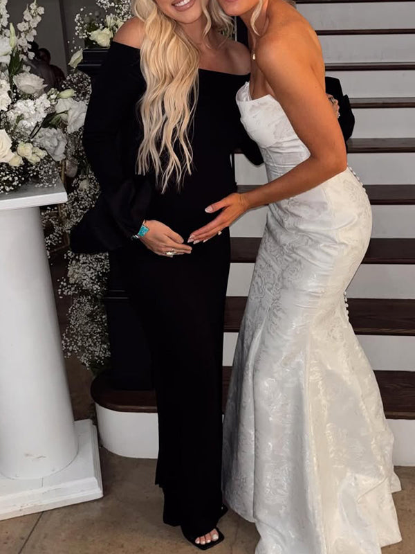 Momyknows Off Shoulder Ruffle Back Slit Flare Sleeve Bodycon Maternity Maxi Dress