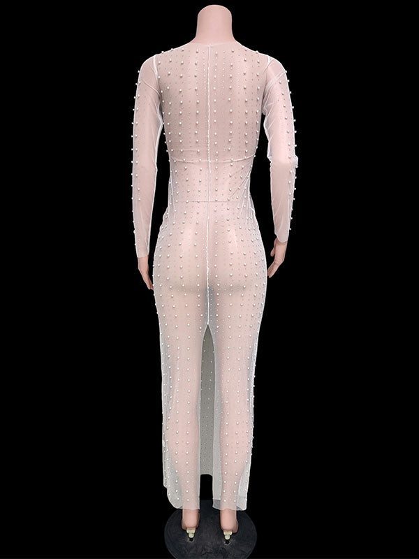 Momyknows Mesh Solid Color Beading Pearl Rhinestone Long Sleeve Cover-ups Side Slit Photoshoot Maternity Maxi Dress