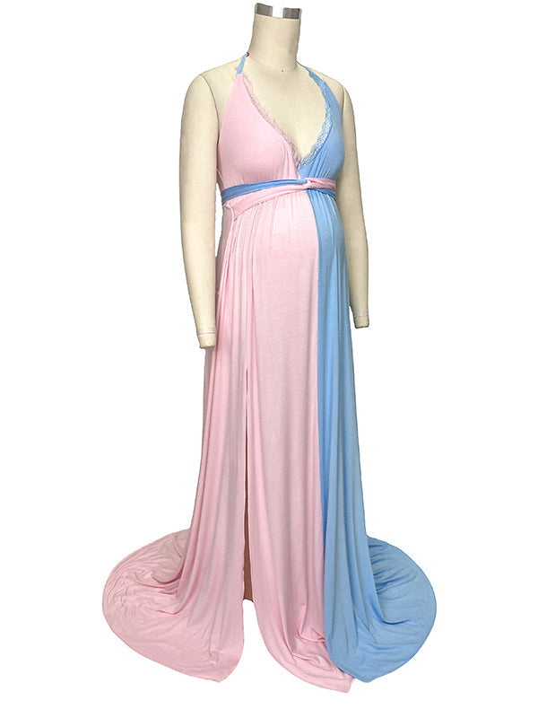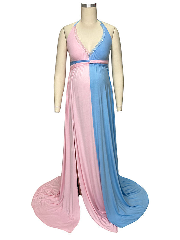 Momyknows Pink&Blue Lace Backless Side Slit Gender Reveal Cute Maternity Maxi Dress