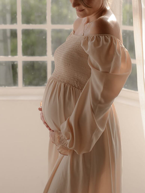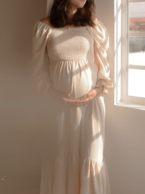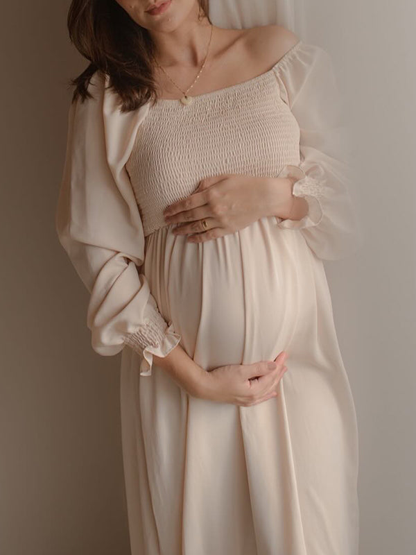 Momyknows Ruffle High Waist Falbala Boho Flowy Long Sleeve Plus Size Baby Shower Maternity Photoshoot Midi Dress