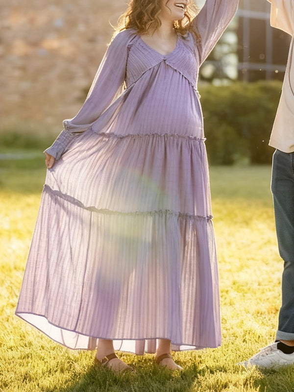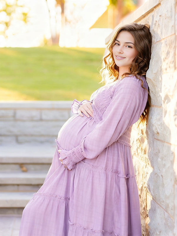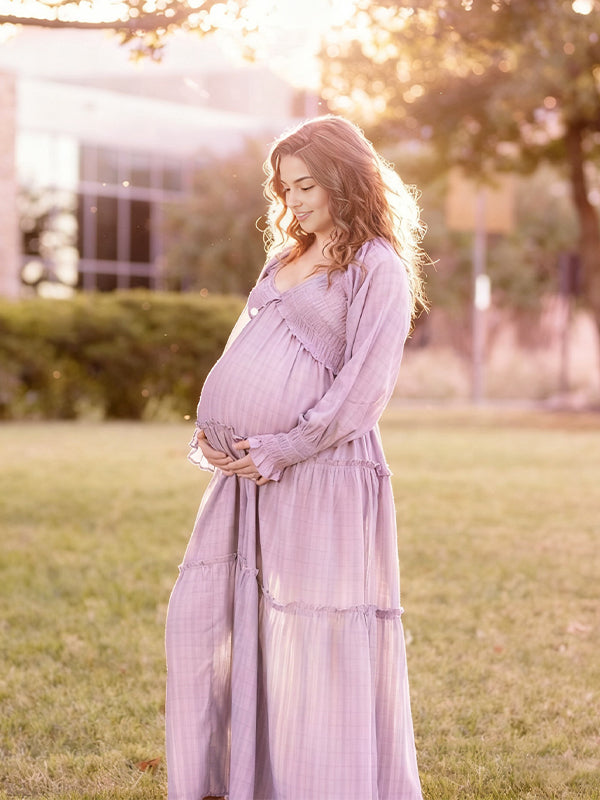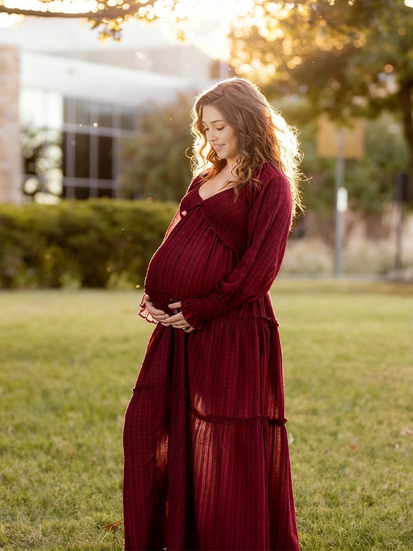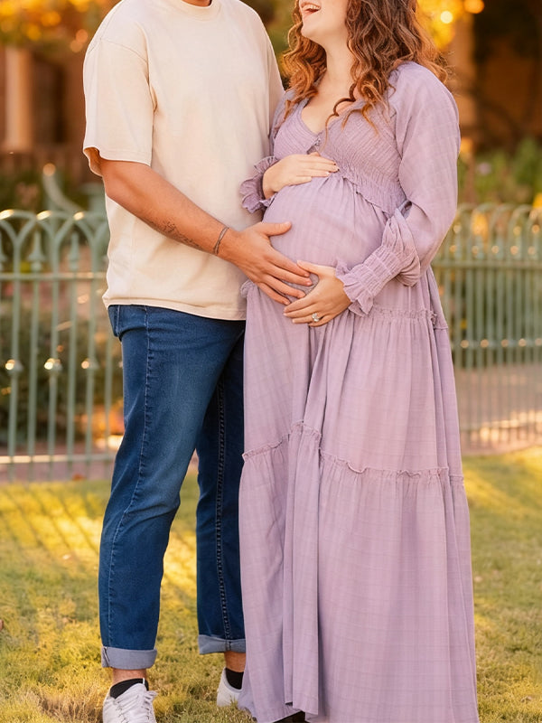Momyknows Smocked Ruffle Plaid Photoshoot Maternity Maxi Dress