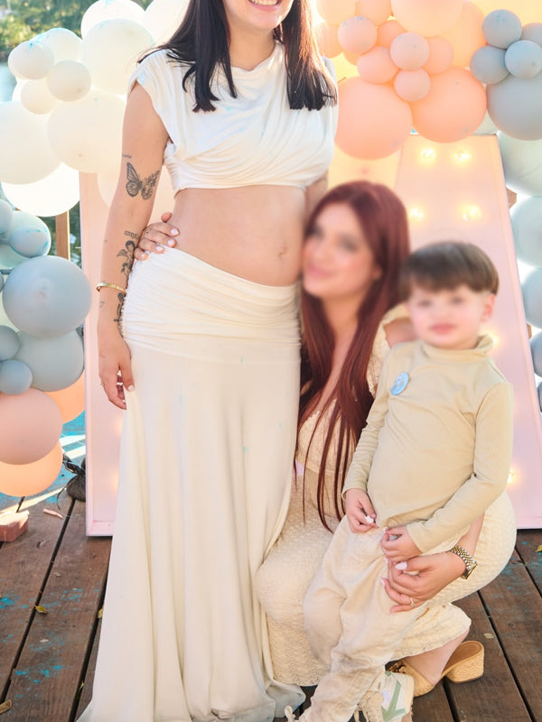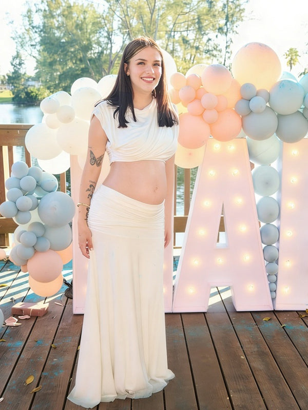 Momyknows White Bare Midriff Ruched Two Piece Maternity Baby Shower Maxi Dress