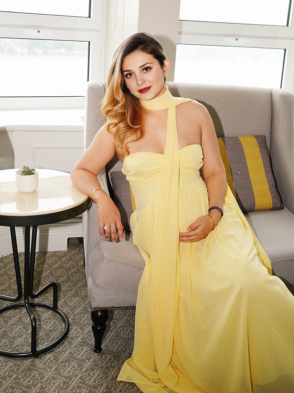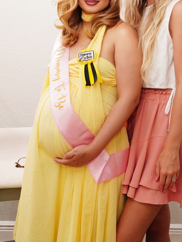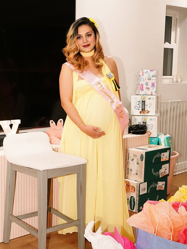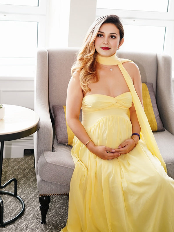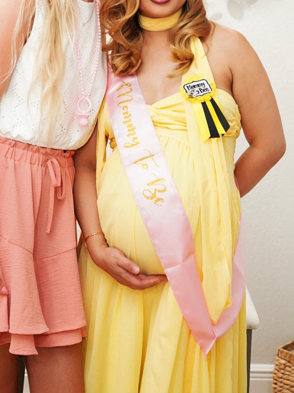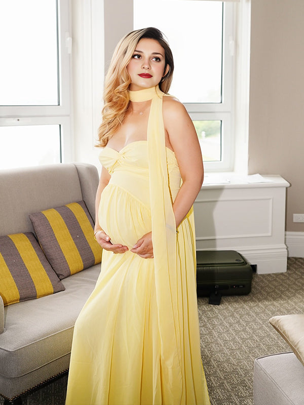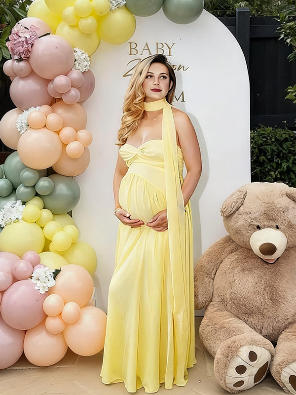 Momyknows Yellow Mesh Ruched Bandeau Big Swing Scarf Sheer Maternity Baby Shower Maxi Dress